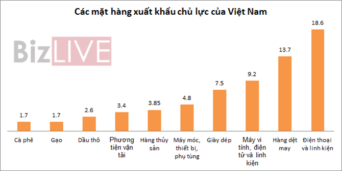 Đóng góp vào mức xuất khẩu này có 10 mặt hàng chủ lực đạt trên 1,7 tỷ USD, bao gồm: Cà phê; gạo; dầu thô; phương tiện vận tải; hàng thủy sản; máy móc, thiết bị, phụ tùng...