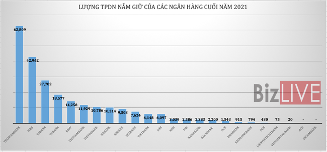 VPBank, TPBank, BIDV, Vietcombank, VietinBank và HDBank cũng là những ngân hàng đang nắm lượng lớn trái phiếu doanh nghiệp, với giá trị trên 10.000 tỷ đồng mỗi ngân hàng.