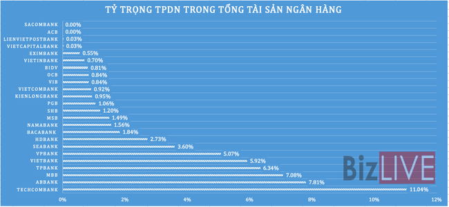 Xét về giá trị tuyệt đối, Techcombank vẫn đang là ngân hàng đứng đầu hệ thống về số lượng trái phiếu doanh nghiệp nắm giữ, với 62.809 tỷ đồng, tăng 16.081 tỷ đồng, tương đương 34,4% so với con số cuối năm 2020. Lượng trái phiếu này chiếm tỷ trọng tới 11% trong tổng tài sản của nhà băng, cao hơn rất nhiều so với tỷ trọng trung bình 2,6% của nhóm khảo sát.