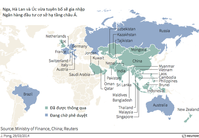 Nga, Hà Lan và Úc tuyên bố sẽ gia nhập Ngân hàng đầu tư cơ sở hạ tầng châu Á (AIIB) do Trung Quốc khởi xướng vào cuối tuần vừa rồi.
