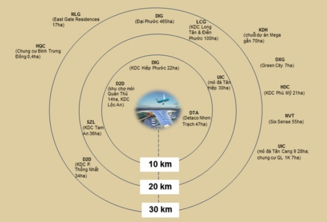 Một nghiên cứu gần đây của Công ty chứng khoán FPTs, cho thấy trong bán kính dưới 40km đã có 15 doanh nghiệp bất động sản đang niêm yết có dự án trong khu vực gần với sân bay Long Thành.