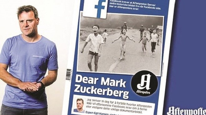 Đầu tháng 9/2016, Facebook bị chỉ trích vì tự ý xóa "Em bé Napalm" - bức ảnh nổi tiếng về chiến tranh Việt Nam. Espen Egil Hansen, tổng biên tập báo Aftenposten, cáo buộc Zuckerberg "lạm quyền" một cách thiếu suy nghĩ. Facebook cho biết đã "điều chỉnh cơ chế đánh giá để cho phép chia sẻ bức ảnh".