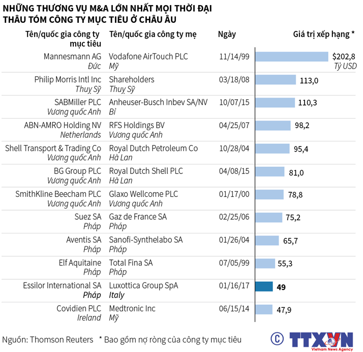 Sự kiện hãng sản xuất kính mắt Luxottica của Italy và tập đoàn chuyên sản xuất tròng kính Essilor của Pháp thỏa thuận sáp nhập ngày 16/1/2017 đã trở thành một trong những thương vụ M&A lớn nhất từ trước đến nay.