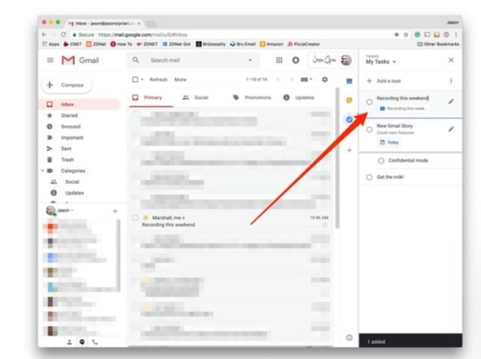Có lẽ tính năng được yêu thích là khả năng kéo email từ hộp thư đến (Inbox) của Gmail vào phần Tasks của bảng điều khiển bên phải để bổ sung thêm nó vào ứng dụng Công việc. Tác vụ được tạo bằng cách sử dụng chủ đề của email làm tiêu đề, với đường dẫn quay lại email trong tài khoản Gmail của bạn để tham khảo trong tương lai.