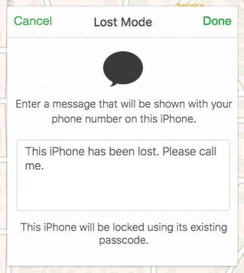 Khi xem vị trí của thiết bị, chọn Actions ở cuối màn hình, sau đó chọn Lost Mode. Rồi nhập số điện thoại và một thông báo sẽ được hiển thị trên màn hình khóa cho bất cứ ai đang cầm thiết bị của bạn để trả lại. Nếu mật mã không được thiết lập trên điện thoại được đặt ở chế độ Lost Mode, bạn sẽ được yêu cầu tạo mật khẩu trước khi bật Lost Mode.