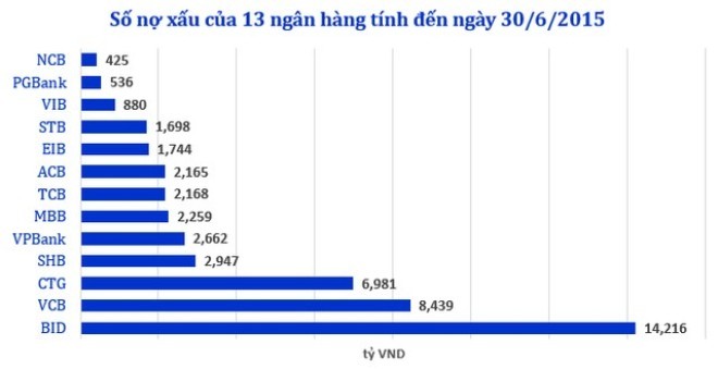 Là những đầu tàu bơm vốn ra nền kinh tế, các ngân hàng TMCP nhà nước như BIDV, Vietcombank và Vietinbank luôn đứng đầu về số nợ xấu xét theo số tuyệt đối.