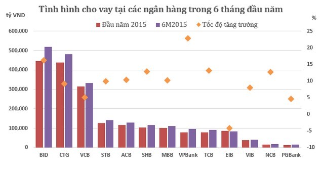 Thống kê từ báo cáo tài chính của 13ngân hàng(ngoại trừ PVCombank và OCB không công bố phần thuyết minh) cho thấy tình hình cho vay của các ngân hàng trong nửa đầu năm 2015 có dấu hiệu tăng mạnh.