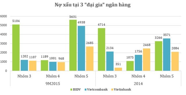 Theo thống kê của người viết từ báo cáo tài chính hợp nhất quý III/2015, tổng số nợ trong 9 tháng đầu năm nay của riêng 3 “đại gia” ngân hàng Vietcombank, Vietinbank và BIDV đã lên tới 23.825 tỷ đồng, tăng 11,2% so với thời điểm cuối năm 2014. Trong số này, nợ có khả năng mất vốn là 13.254 tỷ đồng, chiếm hơn một nửa tổng số nợ xấu.