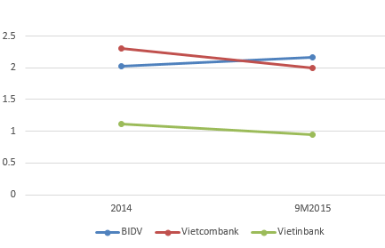 Tỷ lệ nợ xấu của 3 ngân hàng tại thời điểm cuối năm 2014 và cuối tháng 9/2015