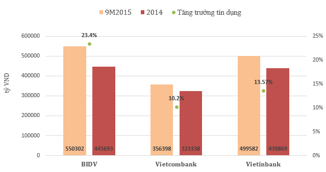 Dư nợ cho vay khách hàng của 3 ngân hàng tại thời điểm cuối năm 2014 và cuối quý 3/2015