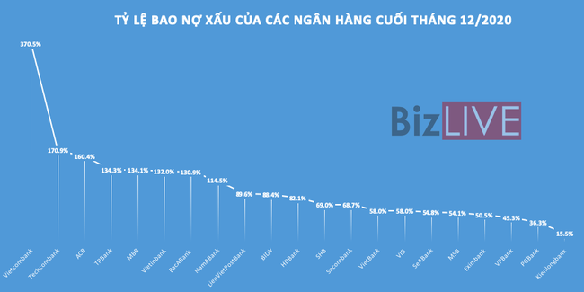 Dữ liệu của BizLIVE cho thấy, đến cuối năm 2020, chi phí dự phòng của 20 ngân hàng tăng tới 27,6% so với đầu năm. Có tới 14/20 ngân hàng có tỷ lệ bao phủ nợ xấu (LLC) tăng trong năm qua, trong đó, có 8 thành viên đạt LLC trên 100%, các biệt có ngân hàng đạt tới 370,5%.