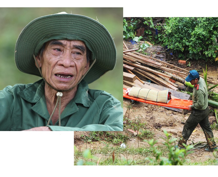Suốt thời gian tìm lực lượng chức năng tìm kiếm, ông Đề dõi đôi mắt nhìn hiện trường đất đá, cây gỗ được bới ra. Mỗi khi tìm được nạn nhân, ông lại chạy đến để nhận dạng người thân.