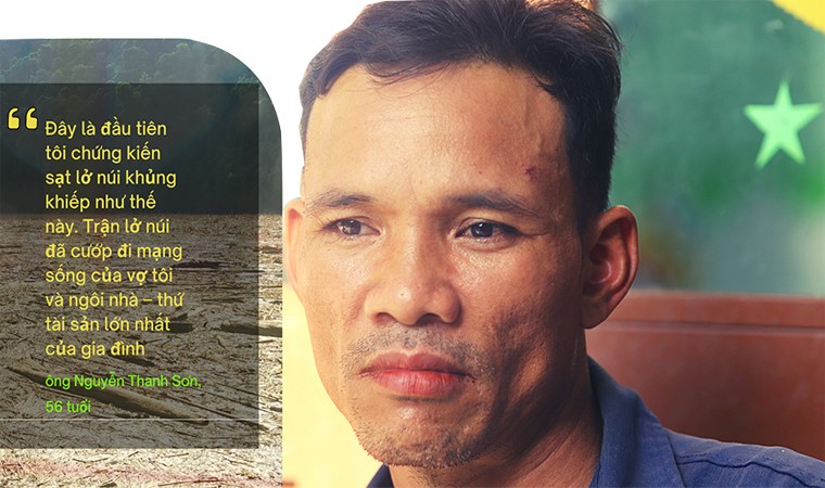 Ông Sơn bảo, hàng năm ở đây có sạt lở núi nhưng ở mức độ nhẹ, gây ách tắc đường sá. “Đây là đầu tiên tôi chứng kiến sạt lở núi khủng khiếp như thế này. Trận lở núi đã cướp đi mạng sống của vợ tôi và ngôi nhà – thứ tài sản lớn nhất của gia đình”, ông kể đầy chua xót khi cả đời tích góp làm được ngôi nhà giờ đã trở thành tay trắng.