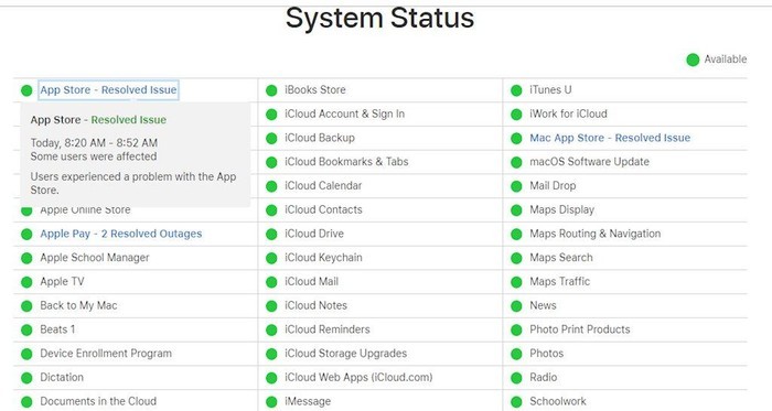 Trên bảng điều khiển về trạng thái hệ thống ở trang chủ, Apple cũng thừa nhận vấn đề, cụ thể lỗi xảy ra vào lúc 5:20 chiều ngày 20/11 và đã được sửa lỗi và ổn định lại vào lúc 5:52 - tức là 32 phút sau đó. Tuy nhiên, công ty vẫn chưa cho biết nguyên nhân xảy ra lỗi và làm thế nào để cố định lại. Chỉ cần nhấn vào mục "App Store - Resolved Issue" bạn sẽ thấy được thông tin chi tiết về thời gian, thông tin lỗi hệ thống này: