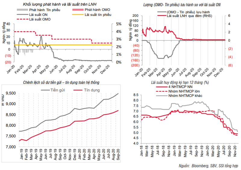 Theo SSI, trong quý cuối năm, tín dụng tăng trưởng khả quan hơn nhưng thanh khoản các NHTM vẫn rất dồi dào, lãi suất liên ngân hàng và lãi suất tiền gửi sẽ vẫn duy trì xu hướng đi ngang trong một vài tháng tới.
