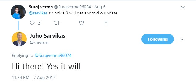 Giám đốc Juho Sarvikas xác nhận với người dùng về bản cập nhật Android O sắp tới cho Nokia 3