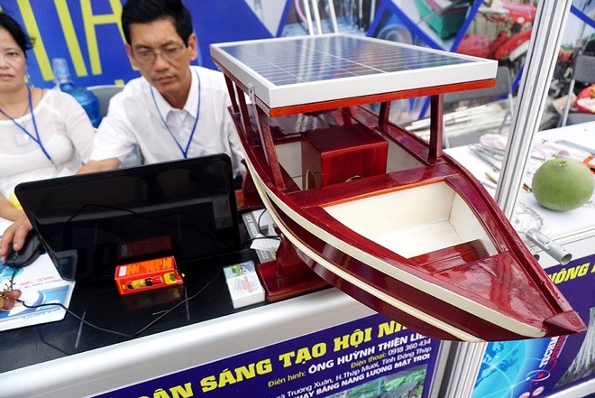 Mô hình thuyền du lịch chạy bằng năng lượng mặt trời - sản phẩm của 4 nhà nông Huỳnh Thiện Liêm, Huỳnh Văn Trăng, Thái Văn Hoàng, Nguyễn Văn Dũng (Đồng Tháp). Xứ này nhiều nắng, nhiều kênh rạch, ông Liêm có ý tưởng chế ra chiếc thuyền chạy bằng pin mặt trời, không dùng nhiên liệu, không gây ô nhiễm môi trường. Mỗi người phụ trách một khâu kỹ thuật để làm nên chiếc thuyền. Thân thuyền dài 1,4 m, rộng 1,3 m, cao 40 cm, gồm 2 tấm pin năng lượng mặt trời, động cơ, hai bình ắc quy để nạp năng lượng. "Thuyền chạy với tốc độ 20 km/h. Hễ trời có nắng là thuyền sẽ chạy, không cần đợi nạp năng lượng. Khi tắt nắng, thuyền dùng năng lượng tích lũy trong bình ắc quy, thời gian lên tới 3 giờ", ông Liêm giải thích.