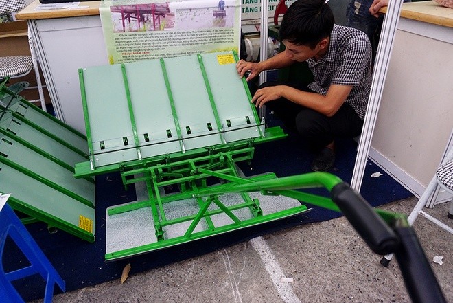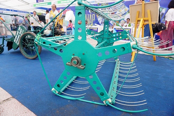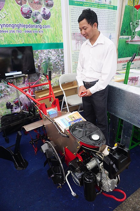 Ông Phan Trung Đạt (Đồng Tháp) mang đến hội chợ chiếc máy đánh tơi rơm sau khi ủ. Máy được chế từ động cơ xe Honda lắp thêm răng xới, hoạt động trong một giờ có thể bằng lao động đánh tơi rơm thủ công trong một tháng.
