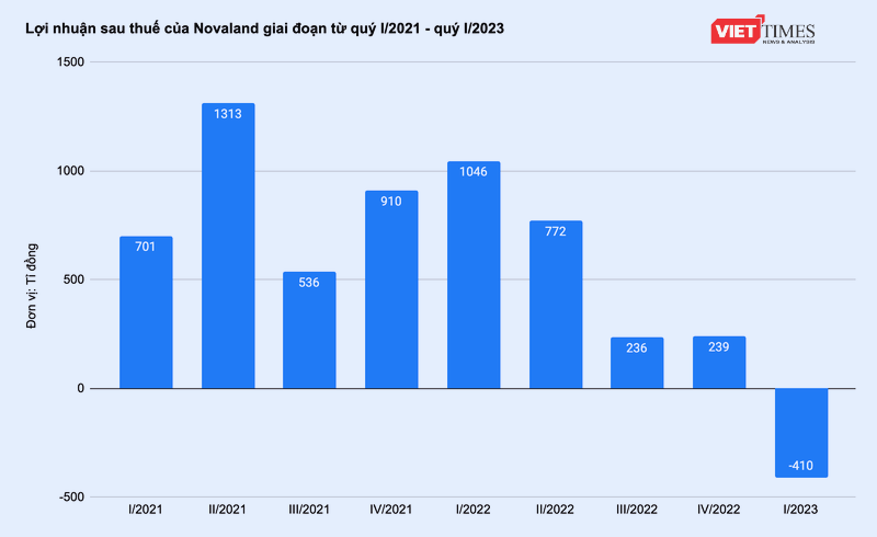 Trừ đi các chi phí khác, NVL báo lỗ sau thuế quý 1/2023 ở mức 410,2 tỉ đồng. Cùng kỳ năm ngoái, họ vẫn lãi 1.046 tỉ đồng. Đây cũng là lần đầu tiên nhà phát triển bất động sản này báo lỗ kể từ khi niêm yết trên sàn chứng khoán.