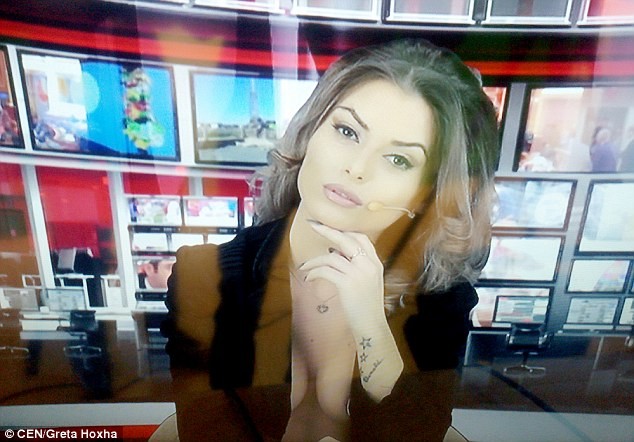 Greta Hoxha trong một buổi dẫn chương trình tại đài truyền hình Albania.