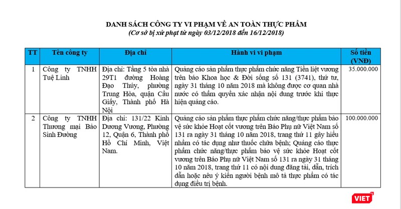 Danh sách hai công ty vi phạm và hành vi vi phạm cụ thể như sau: