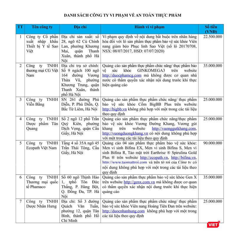 Dưới đây là danh sách các doanh nghiệp vi phạm và bị xử phạt vì vi phạm đó trong đợt này