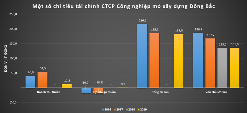 Trong 4 năm gần nhất, doanh thu của Đông Bắc CMI có xu hướng giảm, hiệu quả kinh doanh cũng không được khả quan. Các năm 2016 và 2017, doanh nghiệp này báo lỗ lần lượt là 16,9 tỉ đồng và 18,7 tỉ đồng. Riêng năm 2019, Đông Bắc CMI ghi nhận doanh thu 12,22 tỉ đồng, báo lãi vỏn vẹn gần 68 triệu đồng.