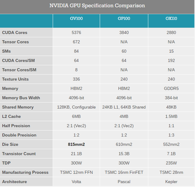 Tuy vậy, việc sử dụng một tiến trình sản xuất "ưu ái riêng" khiến cho chi phí sản xuất GV100 trở nên cực kỳ đắt đỏ. Yếu tố này càng trầm trọng hơn khi đây gần như là con chip lớn nhất thế giới (tính tới khi ra mắt). Những con chip có kích thước càng lớn thì rủi ro bị lỗi trong quá trình sản xuất càng cao. Trên thực tế, sản phẩm hoàn chỉnh mà NVIDIA bán ra dựa trên chip GV100 là card Tesla V100, chỉ có 5120/5376 nhân CUDA sử dụng được. Chiếc card này có năng lực tính toán chính xác đơn (FP32) 15 TFlops, chính xác kép (FP64) 8,5 TFlops và chính xác nửa (FP16) 30 TFlops. Nếu con chip GV100 không bị lỗi, chắc chắn năng lực tính toán của nó sẽ còn cao hơn!