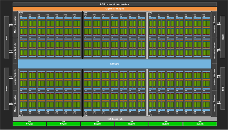 Trước hết, GV100 vẫn là một chip đồ hoạ (GPU). Nó có 5376 nhân CUDA, nhiều gấp 1,4 lần chip GP100 (Pascal) ra mắt trước đó. Nhưng điểm đặc biệt ở GV100 là ngoài các đơn vị tính toán quen thuộc (INT, FP32, FP64), lần đầu trong các kiến trúc chip của NVIDIA xuất hiện nhân Tensor. Đây là nhân tính toán đặc biệt được NVIDIA phát triển để phục vụ cho các phép toán deep learning, vốn đang phổ biến trong nghiên cứu AI, đặc biệt là cái giải thuật về ma trận.