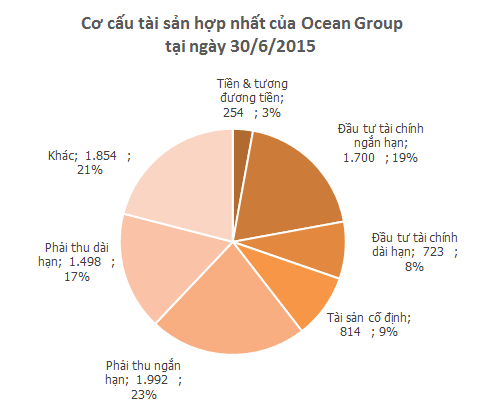 Tính đến cuối quý 2/2015, Ocean Group và các công ty con có gần 7.300 tỷ đồng nợ phải trả, tương đương 82% tổng tài sản. Tuy vậy, các khoản vay nợ ngân hàng không lớn, chỉ hơn 1.600 tỷ đồng - giảm nhẹ so với với cuối năm 2014.