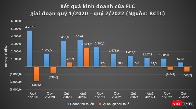 Kết thúc quý 2/2022, FLC báo lỗ sau thuế 640,2 tỉ đồng, trong khi cùng kỳ năm trước lãi 20,9 tỉ đồng. Lũy kế 6 tháng đầu năm 2022, lợi nhuận sau thuế của FLC ở mức âm 1.105,6 tỉ đồng.