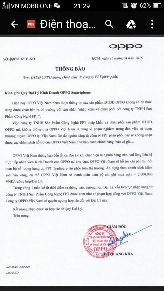 Oppo Việt Nam vừa gửi đến các đại lý thông báo cho biết sẽ thu hồi các sản phẩm điện thoại Oppo do Công ty TNHH Sản phẩm công nghệ FPT (sau đây gọi tắt là FPT) phân phối, đồng thời sẽ hỗ trợ mỗi đại lý 2.000.000 đồng và trả toàn bộ số tiền đại lý đó đã thanh toán cho FPT.