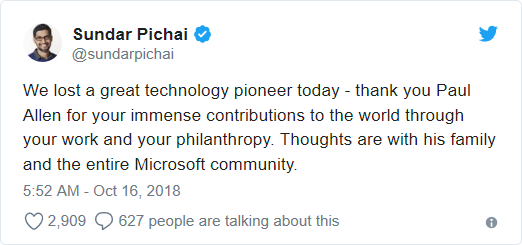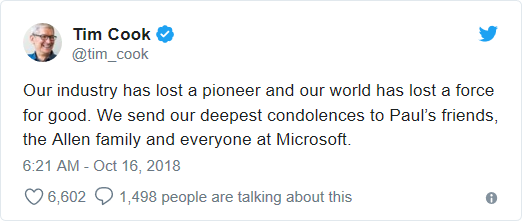 CEO Apple gọi ông Allen là “nhà tiên phong” và đại diện cho những điều tốt đẹp: “Ngành công nghệ của chúng ta đã mất đi một nhà tiên phong và thế giới mất đi một đại diện cho những điều tốt đẹp. Chúng tôi xin gửi lời chia buồn sâu sắc nhất đến bạn bè của Paul, gia đình Allen và mọi người ở Microsoft”.