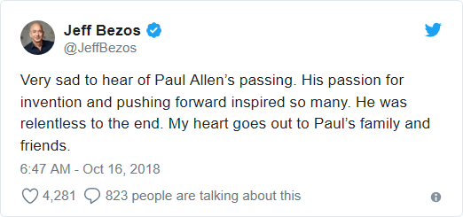 Giám đốc điều hành Amazon, Jeff Bezos cũng dành sự tri ân cho ông Allen vì cống hiến “không ngừng” thúc đẩy sự phát triển của công nghệ: “Tôi rất buồn khi hay tin Paul Allen qua đời. Niềm đam mê và phát minh của ông là niềm cảm hứng cho rất nhiều người. Ông đã nỗ lực không ngừng tới cùng. Trái tim tôi dành trọn cho gia đình và bạn bè của Paul”.