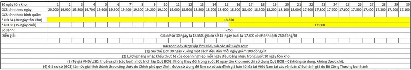Ví dụ cụ thể cho thấy: Nếu lấy giá cơ sở theo bình quân 30 ngày để xác định giá bán theo Nghị định 84/2009/NĐ-CP thì doanh nghiệp có lãi định mức 300 đồng/lít (không bị lỗ). Tuy nhiên, khi lấy giá cơ sở theo bình quân 15 ngày cuối của chu kỳ tồn kho 30 ngày quy định tại Nghị định 83/2014/NĐ-CP để xác định giá bán tối đa thì thiếu 750 đồng/lít.