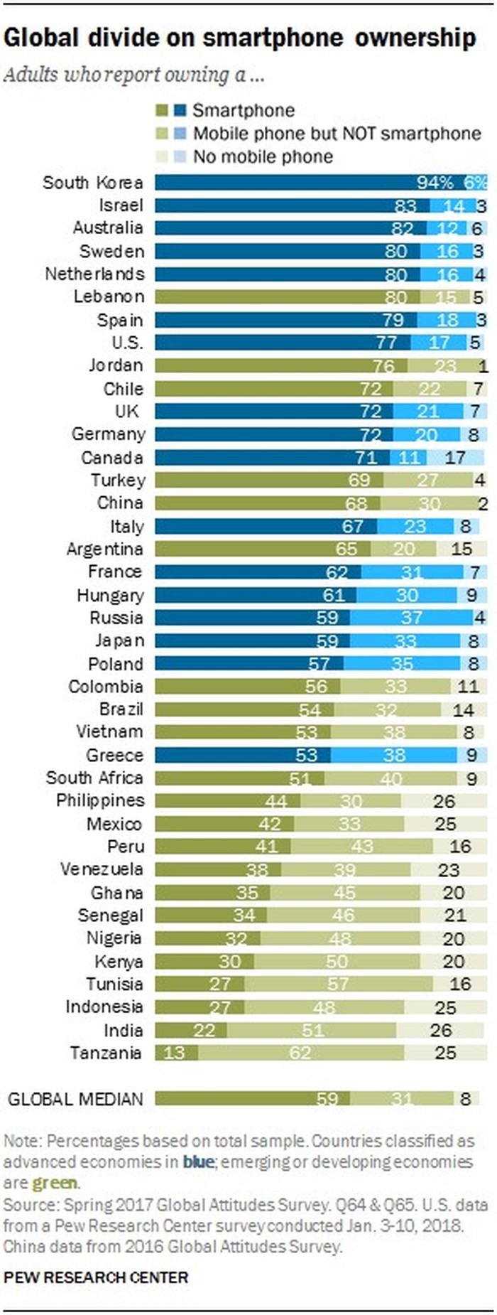 Cụ thể, Hàn Quốc ghi nhận tỷ lệ người dùng sở hữu smartphone lên tới 94% tổng dân số. Đứng thứ hai là các quốc gia như Israel (83%), tiếp theo là Úc (82%); Thụy Điển, Hà Lan và Lebanon (đồng 80%), Tây Ban Nha (79%), Mỹ (77%), Jordan (76%). và Chile, Anh và Đức (đồng 72%).
