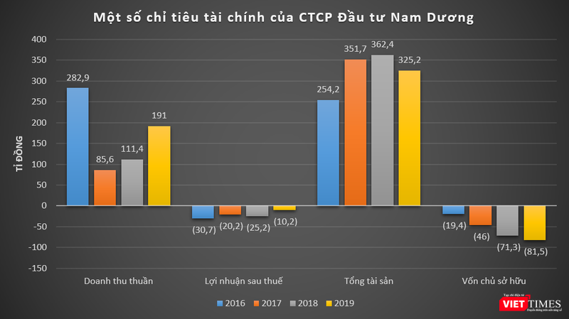 Năm 2016 và 2017, Nam Dương ghi nhận doanh thu thuần đạt lần lượt 282,9 tỉ đồng và 85,6 tỉ đồng, lỗ sau thuế ở mức 30,7 tỉ đồng và 20,2 tỉ đồng.