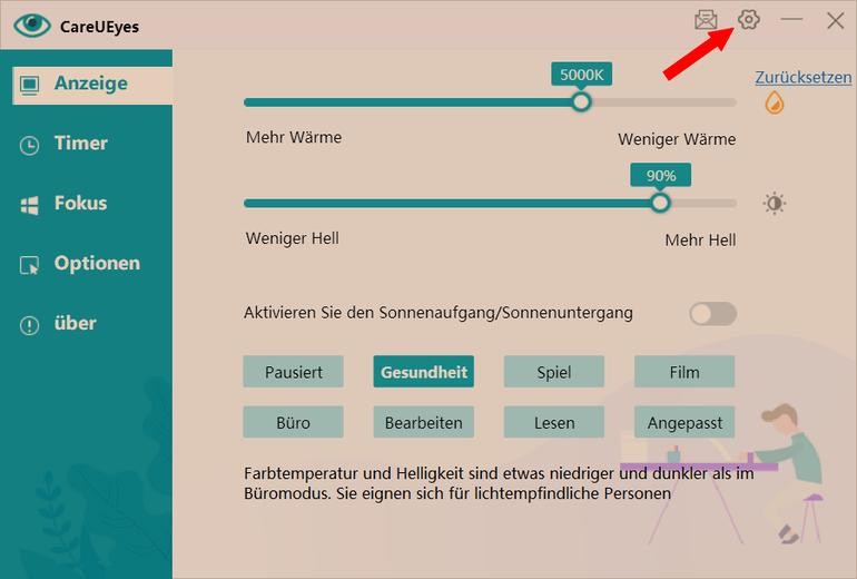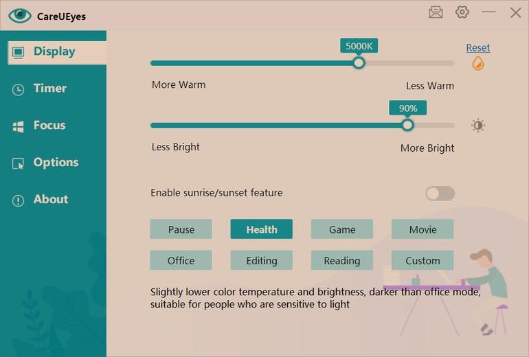 Ngay sau khi cài đặt máy tính, CareUEyes sẽ tự động điều chỉnh chế độ sáng để lọc ánh sáng xanh trên màn hình máy tính. Nếu đang sử dụng máy tính vào ban đêm, bạn sẽ cảm nhận được rằng ánh sáng tỏa ra từ màn hình dịu nhẹ hơn rất nhiều.