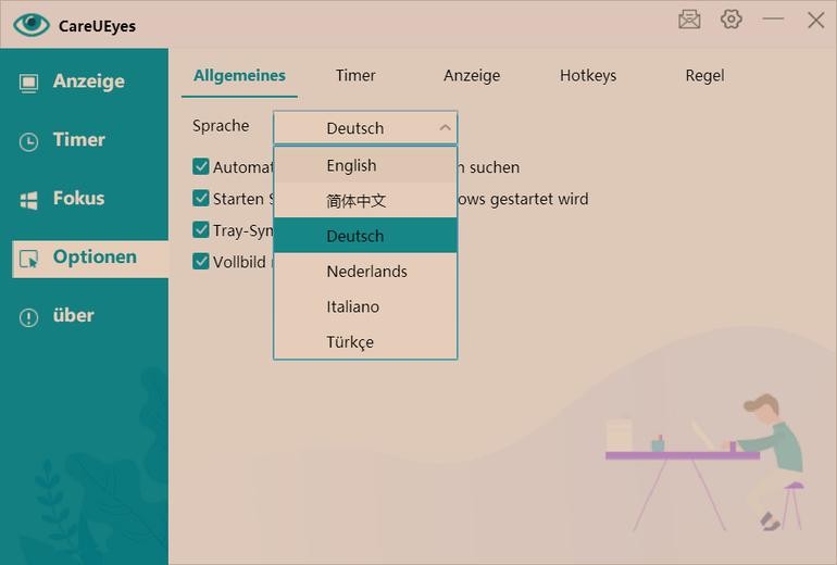 Trong một số trường hợp, giao diện mặc định của CareUEyes sau khi cài đặt lên máy tính sẽ được hiển thị bằng tiếng Đức. Bạn có thể chuyển giao diện phần mềm về tiếng Anh để sử dụng được thuận tiện hơn.