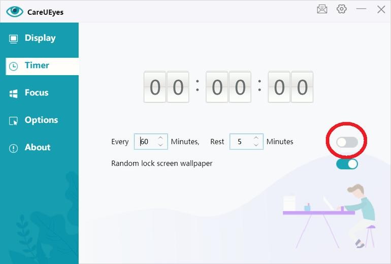 Để sử dụng chức năng này, nhấn vào mục "Timer" ở menu bên trái để thiết lập khoảng thời gian nghỉ ngơi. Mặc định chức năng này sẽ bị vô hiệu hóa trên phần mềm, bạn nhấn vào nút công tắc (khoanh đỏ ở hình minh họa bên dưới) để kích hoạt.