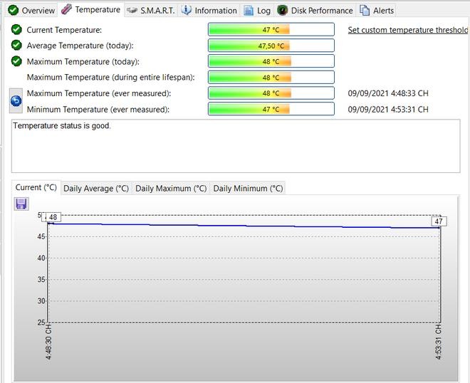 Nhấn vào tab "Temperature" ở khung bên phải giao diện phần mềm sẽ cho phép người dùng theo dõi nhiệt độ của ổ cứng trong ngày (bao gồm nhiệt độ hiện tại, mức cao nhất, thấp nhất và trung bình), hoặc chọn tab "Information" sẽ hiển thị đầy đủ thông tin về ổ cứng mà bạn đang sử dụng (như hãng sản xuất, chuẩn kết nối, tổng dung lượng, những tính năng hỗ trợ…), tab Alert để đưa ra các thông báo cho người dùng biết nếu ổ cứng gặp vấn đề hay trở ngại nào đó (lỗi đọc dữ liệu, nhiệt độ tăng cao bất thường...).