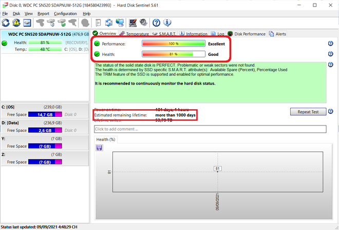 Giao diện chính của HD Sentinel sẽ hiển thị thông tin về ổ cứng, như tình trạng sức khỏe (Health) và hiệu suất hoạt động (Performance). Nếu 2 thông số này vẫn hiển thị ở mức màu xanh, nghĩa là ổ cứng của bạn vẫn hoạt động ở trạng thái ổn định nhất và không gặp phải lỗi nào.
