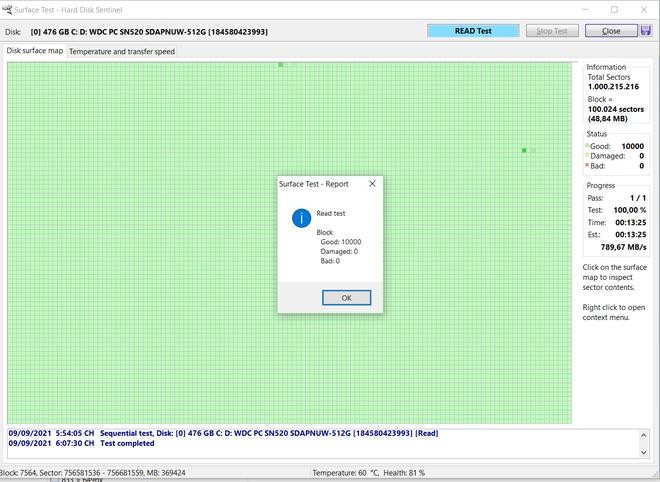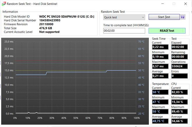 Nhấn nút "Start Test" từ hộp thoại hiện ra để bắt đầu quá trình kiểm tra ổ cứng. Sau khi quá trình kiểm tra kết thúc, nếu biểu đồ nằm dưới vạch vàng và đỏ, nghĩa là tình trạng của ổ cứng vẫn ổn định, không bị quá nhiệt sau một thời gian đọc/ghi dữ liệu liên tục.