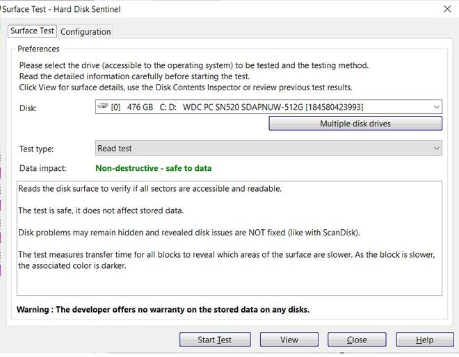Ngoài ra, bạn có thể chọn chức năng kiểm tra "Surface Test". Đây là chức năng kiểm tra quan trọng và hữu ích nhất mà HD Sentinel trang bị cho người dùng, sẽ kiểm tra toàn bộ bề mặt của ổ cứng để đảm bảo quá trình đọc/ghi dữ liệu trên ổ đĩa đang hoạt động ổn định và không có lỗi nào có thể xảy ra.