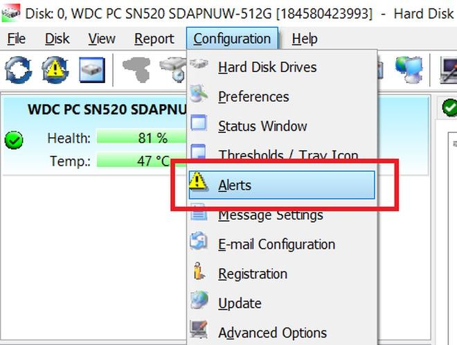 HD Sentinel còn có tính năng cảnh báo người dùng nếu phát hiện các vấn đề bất thường trên ổ cứng, để người dùng có phương án xử lý hoặc sao lưu dữ liệu kịp thời. Để kích hoạt tính năng này, từ giao diện chính của phần mềm, bạn chọn "Configuration -> Alerts" từ menu của phần mềm.