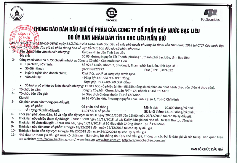 Nên biết, chỉ cách đây ít lâu - ngày 31/08/2018, cũng chính Chủ tịch UBND tỉnh Bạc Liêu đã phê duyệt Phương án thoái vốn nhà nước tại Bawaco, trong đó xác định rõ phương thức chào bán là “Không thực hiện trên hệ thống giao dịch chứng khoán (thực hiện theo thứ tự Đấu giá công khai, chào bán cạnh tranh, thỏa thuận)”. Trên cơ sở Quyết định này, người đại diện vốn nhà nước tại Bawaco mới tiến hành các bước tiếp theo của thương vụ đấu giá dự kiến được tổ chức vào chiều ngày 17/12/2018.