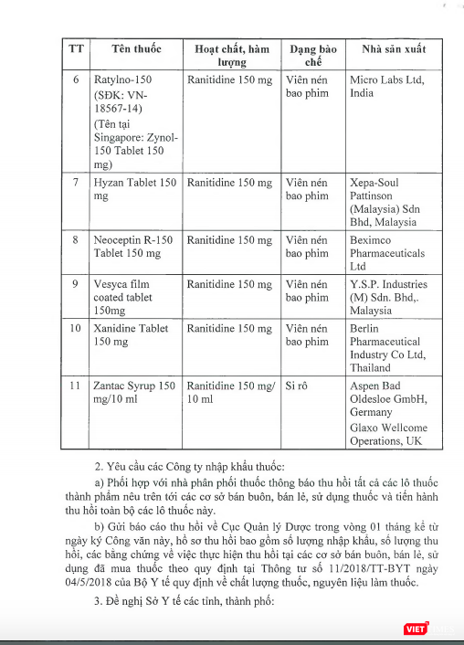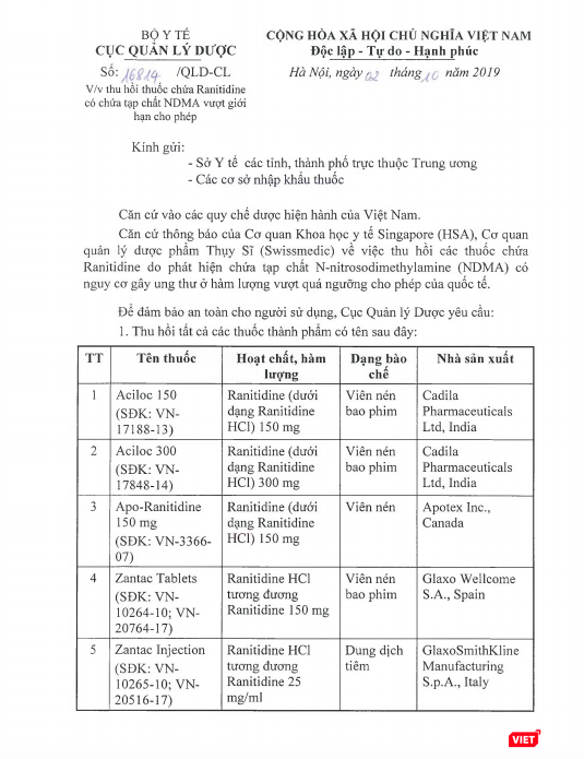 Được biết, cơ quan Khoa học y tế Singapore (HSA), Cơ quan quản lý dược phẩm Thụy Sĩ (Swissmedic) đã có thông báo về việc thu hồi các thuốc chứa Ranitidine do phát hiện các thuốc này chứa tạp chất N-nitrosodimethylamine (NDMA) có nguy cơ gây ung thư ở hàm lượng vượt quá ngưỡng cho phép của quốc tế.