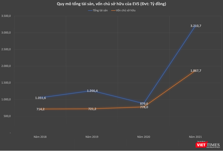 Tính đến ngày 31/03/2022, tổng tài sản của EVS đã đạt 3.304,44 tỉ đồng, bằng 2.9 lần giá trị tổng tài sản so với thời điểm cuối quý 1/2021, quy mô tài sản đạt 1.141,87 tỉ đồng. Trong đó, quy mô FVTPL (giá trị danh mục tự doanh) tăng 120%, đạt gần 928 tỉ đồng vào quý I. Vào thời điểm kết thúc tháng 3, công ty nắm giữ lượng tiền mặt gấp 7 lần so với cùng kỳ, đạt 362 tỉ đồng.