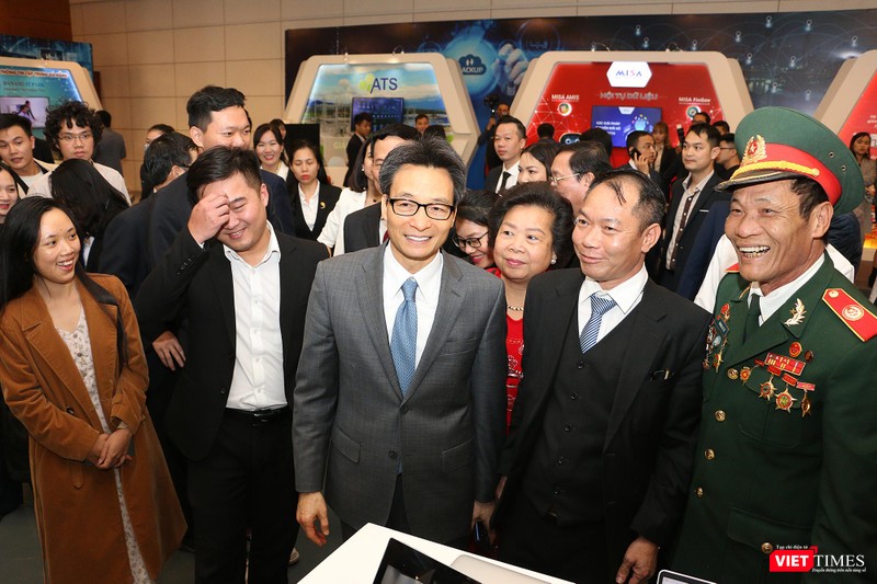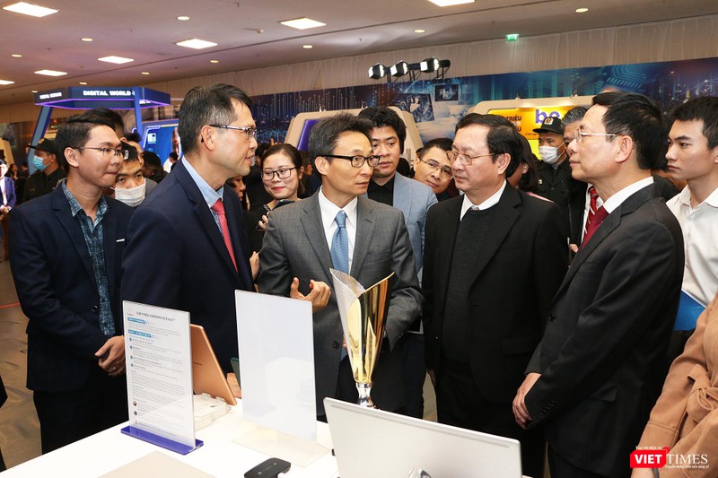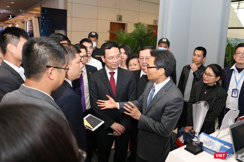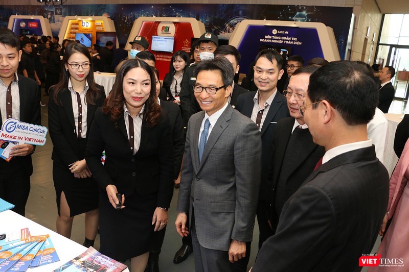 Phó Thủ tướng Vũ Đức Đam thăm các gian hàng giới thiệu sản phẩm của các công ty công nghệ tại Diễn đàn Quốc gia phát triển Doanh nghiệp Công nghệ số Việt Nam (ảnh: Đăng Khoa)