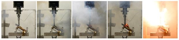 Hình ảnh Samsung Note 7 phát nổ khi sử dụng áp suất bằng với áp suất của pin sạc đầy trong một thử nghiệm tại phòng thí nghiệm pin Applied Energy Hub ở Singapore vào 06/10 vừa qua.